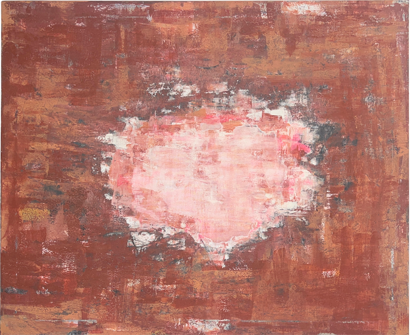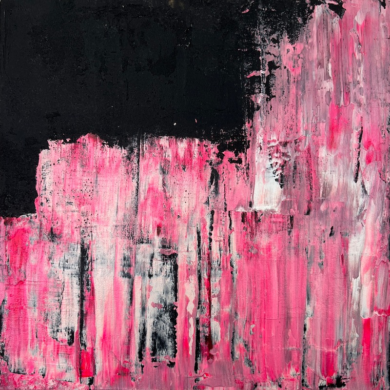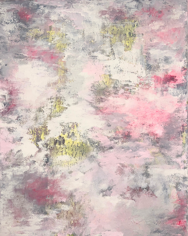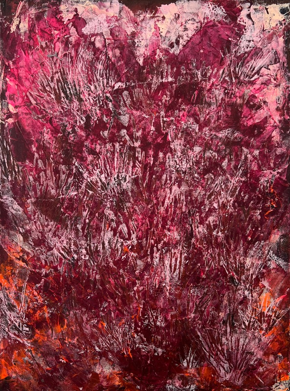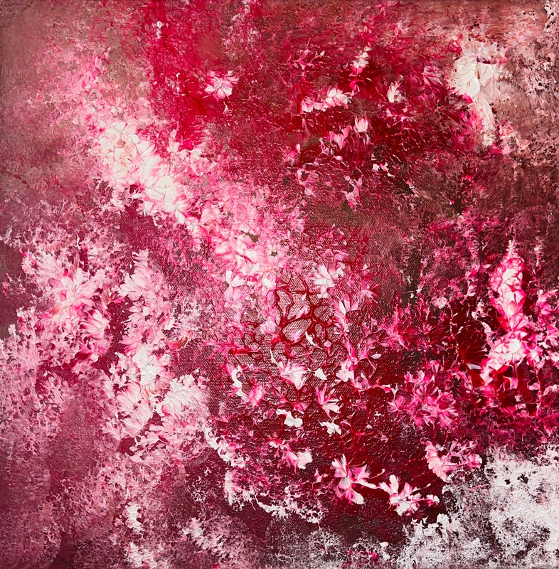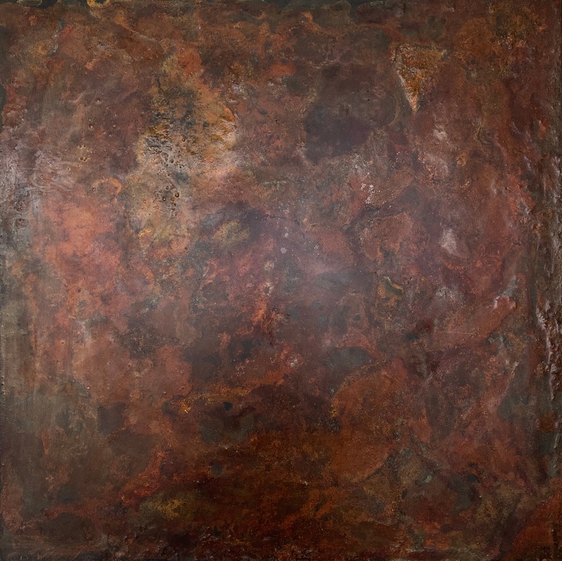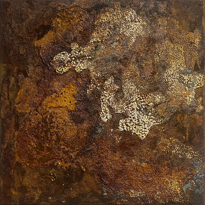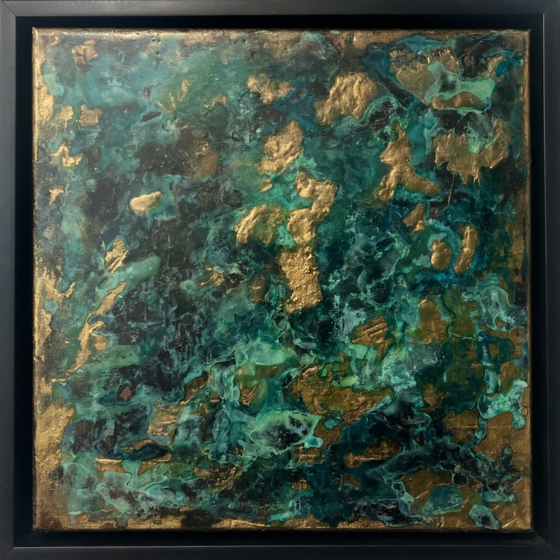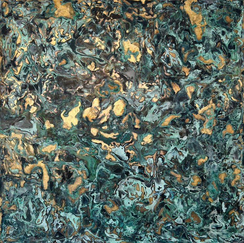 She blends experimentation, technique, introspection, and therapy, with acrylics, metal powders, chemical reagents, and resins.